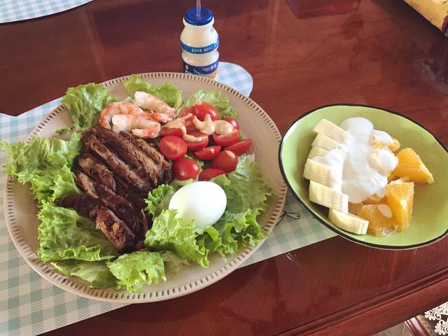 切块牛肉,一个水煮蛋,少许虾,生菜也要吃完的哦