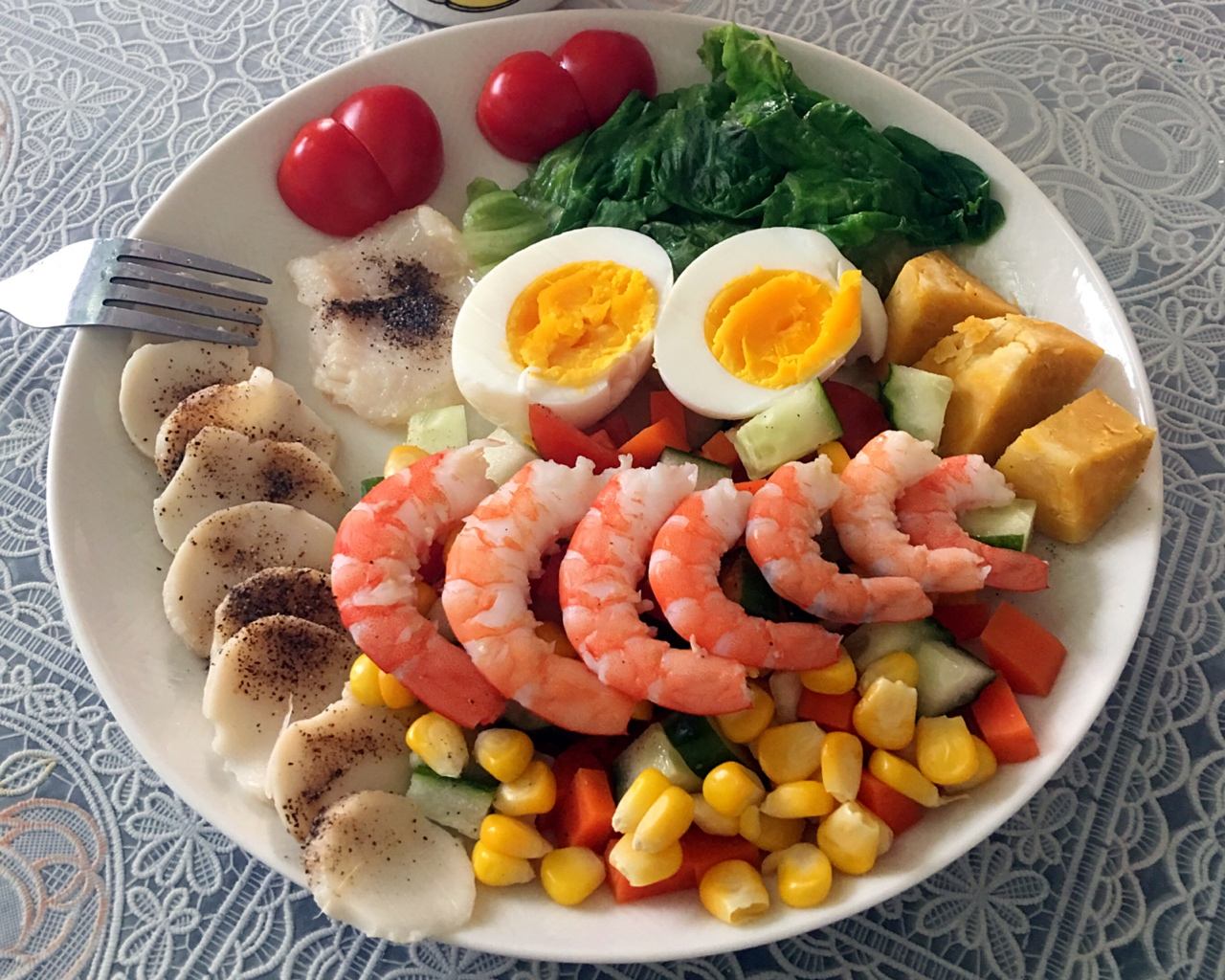 水煮虾,玉米沙拉,北极贝